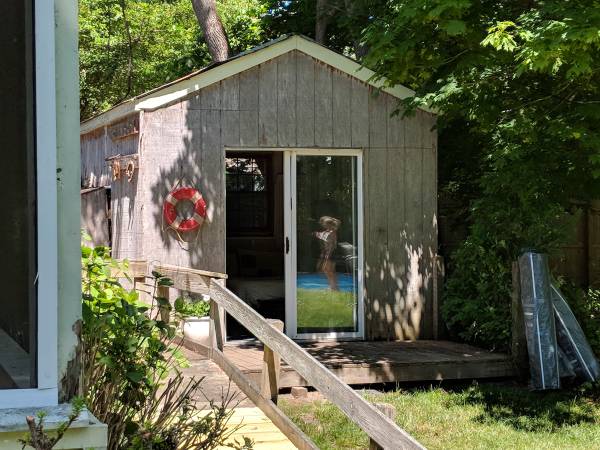 A separate a guest "bungalow" with sliding glass door, four double-hung windows, and a ceiling fan, offers guests privacy from the rest of the home, or can double as an office/studio (shown in last two photos).