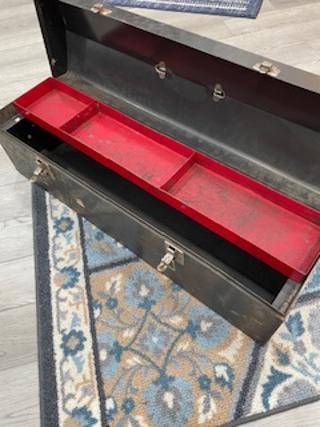 Metal 32" Toolbox with side and top handles for easy carry. A nice storage solution for small tools, fishing tackle, or crafts. Great size for your car, boat, or off the road camper. Has side and top grab handles with a center tool tray for all to essentials. Great for keeping your tools and fishing gear organized.