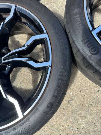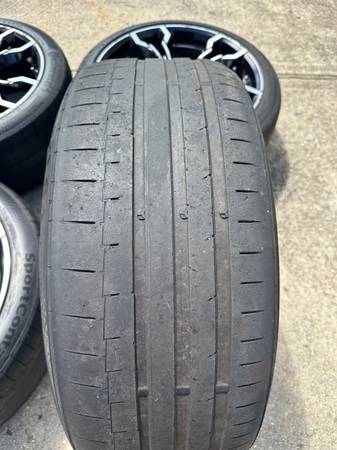 Front: 21x9.5" ET31 - matched - Continetal SportContact 6 - 255/40/21 - Worn out. But hold air. Has minimal of tread left to use.