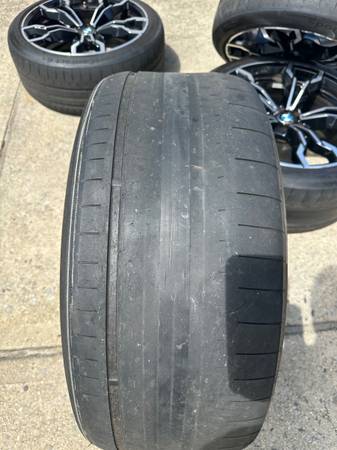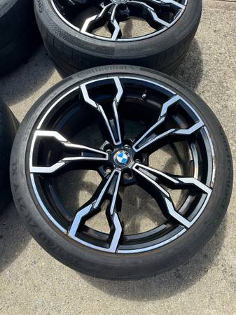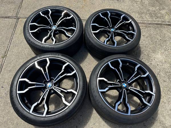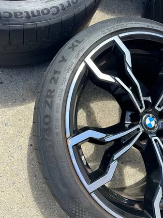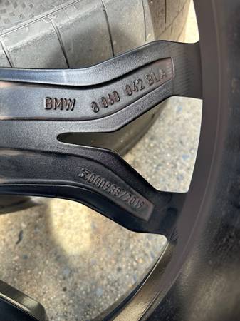 Selling a set of Original 21" BMW OEM Style 765M wheels/rims with tires. They came off a 2022 BMW X3M/X4M. Will also fit X3M40i, X4M40i . Comes with center caps and TPMS. Wheels are in good condition with curb rashes from parking. All wheels have curb rash. All wheels have no bent, no cracks. All hold air. Tires are pretty worn out. Will need replacement.