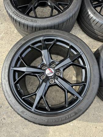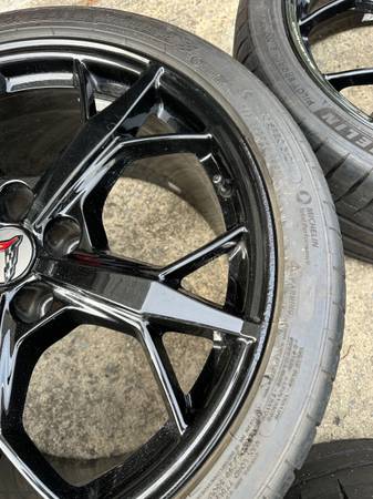 Selling a set of (4) factory C8 Corvette Stingray wheels. The wheels are in great shape with minor curb rash which has been touched up. The wheels were used for about 500 miles. All wheels come with factory OEM center caps. No bents no cracks. We switched to aftermarket track wheels. Wheels come with regular valve stem only. Tires are in like new condition. Wheels have some water marks from cleaning on pictures.