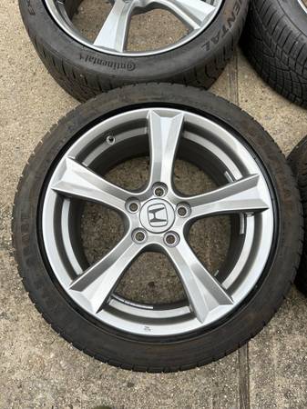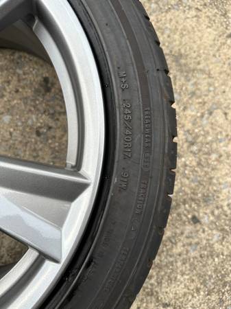 Tires - (2) Matched - Continental ExtremeContact DWS06 all season - Front 215 45 17, (2) matched - Goodyear Eagle Sport all season - Rear 245 40 17. Front tires have 40-50% tread left. Rear tires have 70-80% tread left. All wheels hold air, balanced and ready to go. One of the tires has slight damage on tread. But it holds air. Would recommend replacing.