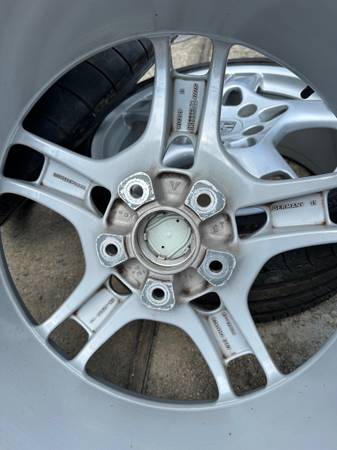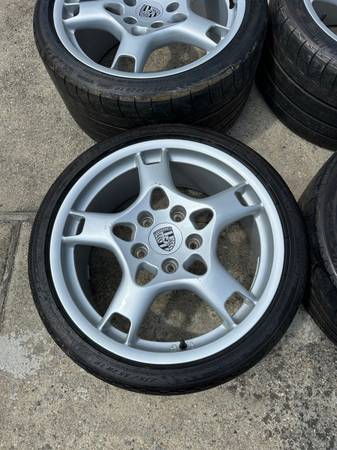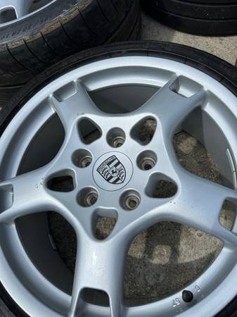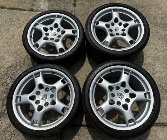 Selling a set of Porsche 911 997 19" Lobster Claw wheels. These are the original tires and Porsche OEM Crest Center Cap set. Wheels and Tires are in great condition with some minor marks from storage(See picture). There is no structural damage such as bends, cracks. The wheels are straight and round. These wheels and tires will fit Narrow BOBY 997, 996, 993, 944, 928 and other Porsche models. They are in very good condition. Tires are old and have dry rot but all hold air.
