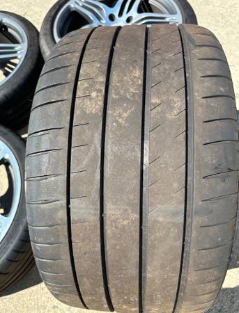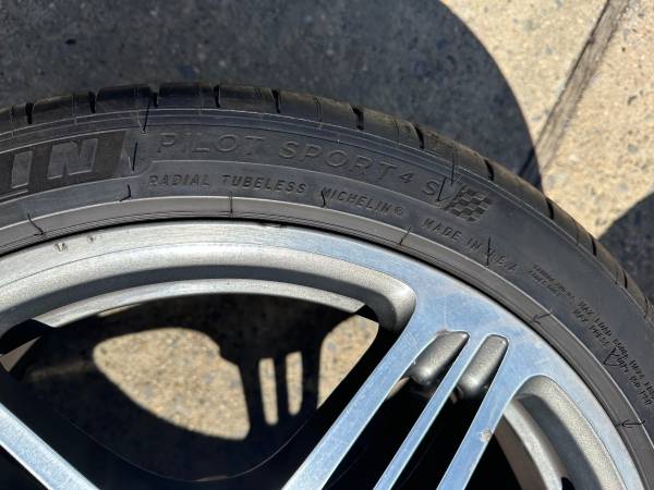 Rear Wheel: Size: 19x11, Offset: 51mm. Rear Tire Size: 305/30/19" - Michelin Pilot Sport 4s. Both tires have 70% tread left to use. Part number: 99736216202
