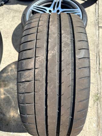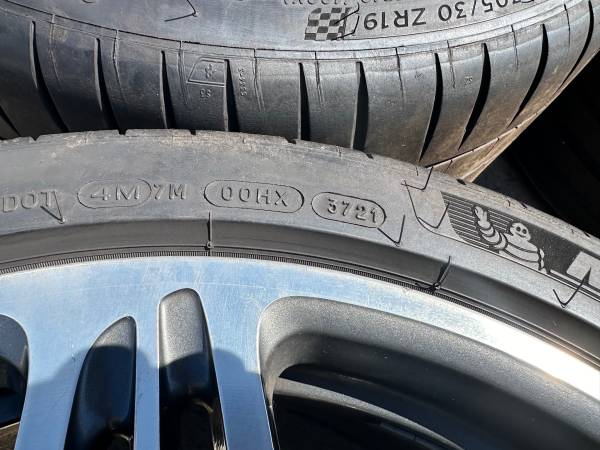 Front Wheel: Size: 19x8.5, Offset: 56mm. Front Tire Size: 235/35/19" - Michelin Pilot Sport 4s. Both tires have 80% tread left to use. Part number: 99736215605. One of the front tires has camber wear. See picture.