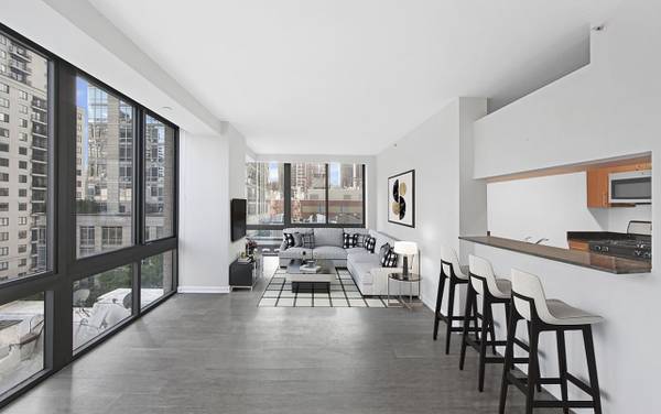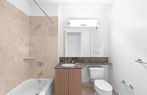 Fantastic bright Flex 3 ROOMS apartment ! Very good spacious space , excellent living space following the flex . Fully equipped kitchen with breakfast bar . Washer and Dryer in the apartment . Full service building with all the needed amenities - Gym , Pool , Storages , Outdoor space . Quick 2 minutes walk to the subway. Price is net effective . .