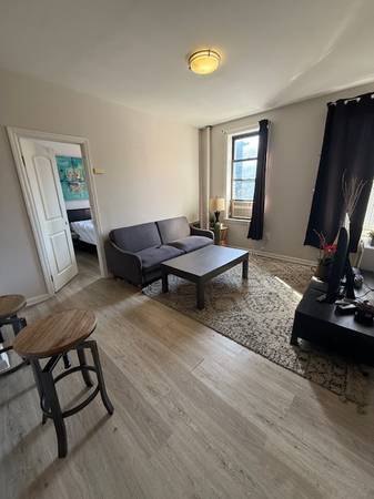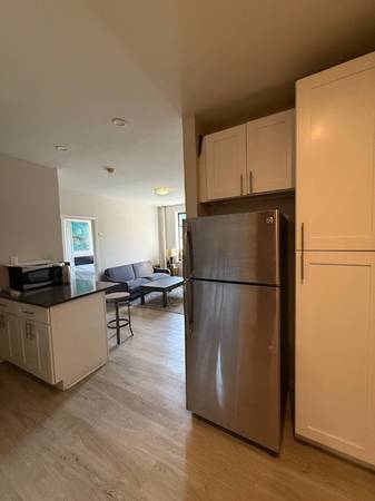 The unit features an open modern kitchen with stainless steel appliances and black quartz countertops, a spacious and bright living room, and hardwood floors throughout.
