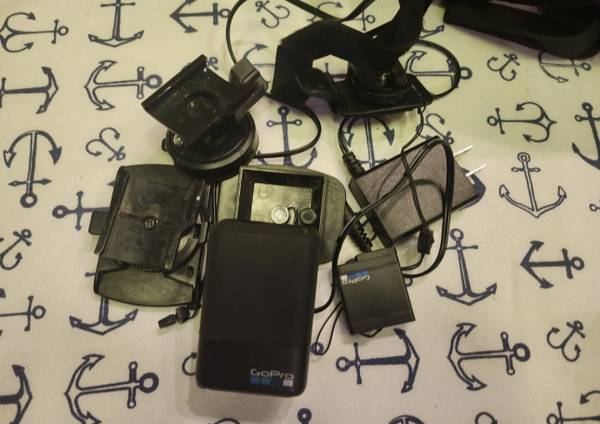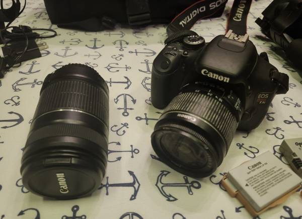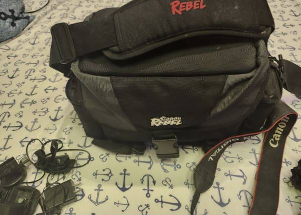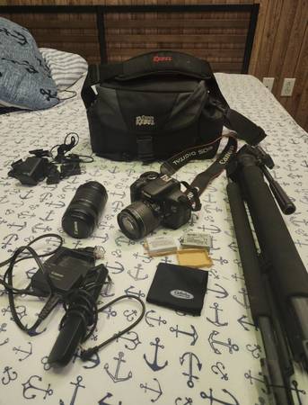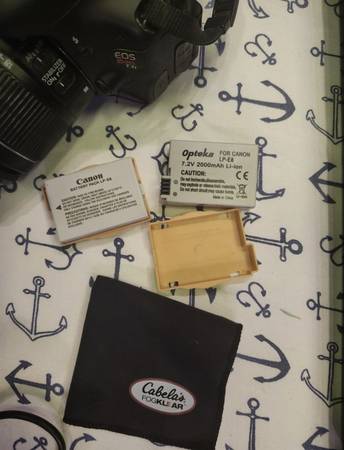 Comes with Canon EOS Rebel 13i Camera, Onn Tripod, Bag for Camon Rebel, a extra Camera Lens (I Beleive it is), 2 batteries, battery charging port, Progo camera intervalometer, Random Go Pro Accessories, and a handful of lens wipes inside the bag.