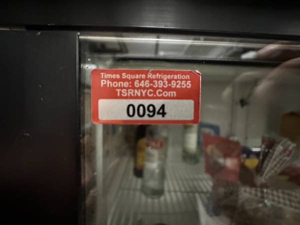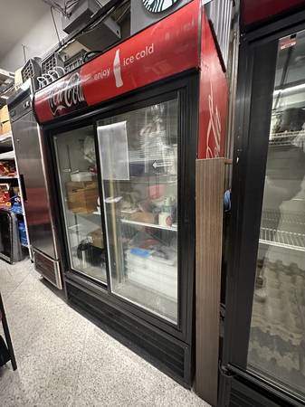 We have an older model, classic Coca-Cola double swinging door cooler with the iconic branding. It is still in full working condition, but it shows its age with cosmetic wear: scratches and dings