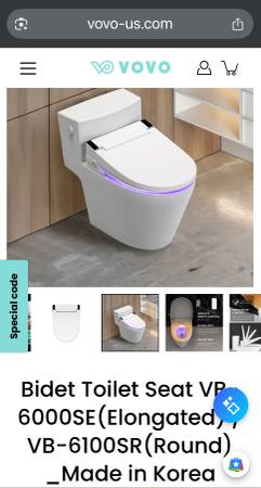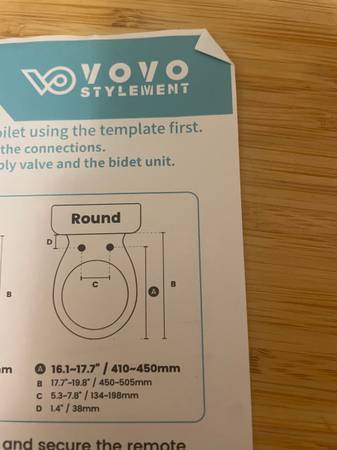 Selling a brand new, never-installed VOVO VB-6100SR Premium Bidet Seat compatible with “round” toilets (see photo for applicable dimensions). I opened the box but never installed. I am moving into an apartment with a tankless toilet so cannot use.