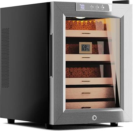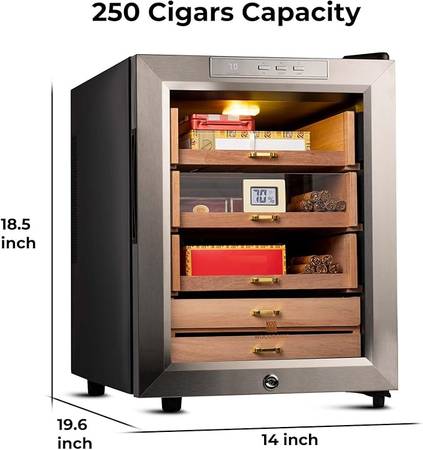 Woodronic Cigar Cooler Humidor for 250 Cigars, 33L Electric Cigar Fridge for Temperature Control, Spanish Cedar Lined Shelves with Dividers, Digital Hygrometer, Humidifiers and Humidor Solution.