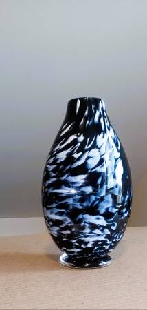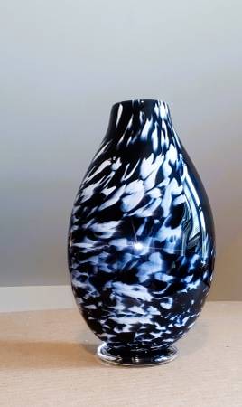 Hand blown on Sunday 10/5/25 at The Studio at the Corning Museum of Glass in Corning, NY. 11"x 7" x 4" Black with white feather spots by SABOO one of a kind. 2 layers of glass