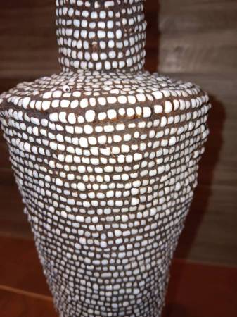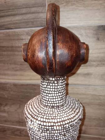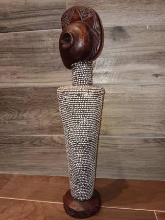 African Beaded 'Namji' Hard Carved Wooden Doll ... From the ethnic Namji peoples of Cameroon , vintage in great condition with white embedded beading intact . Stands at 18" , base 3 3/4" width ...and 4 1/2" at its widest point - top . On sale at just $40 (Worth Much More !!)