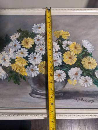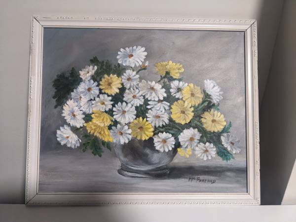 Artwork on canvas- with signature. Small dent- see pics and frame not in great shape but can be swapped out See pics