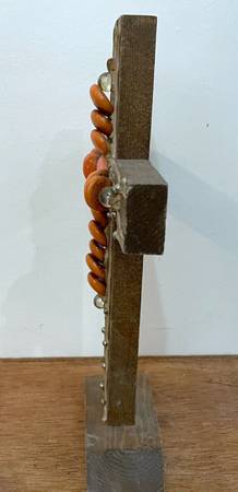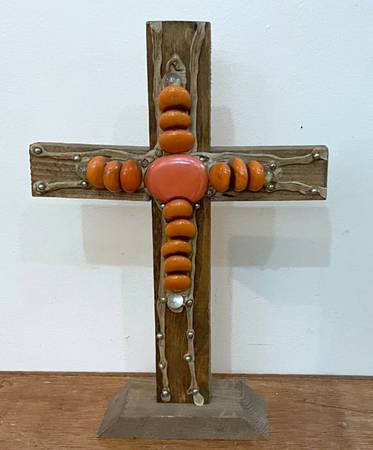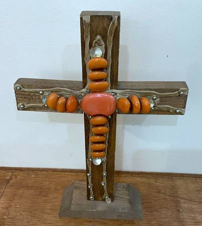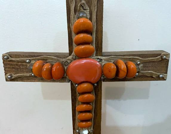 BEAUTIFUL VINTAGE SOUTHWESTERN WOODEN CROSS DECORATED WITH ORANGE COLOR STONES Size: 11" tall 7" 3/8 wide CONDITION: In very good vintage condition, no visible damage AVAILABLE FOR PICKUP ONLY (78th...