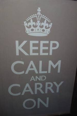 Taupe print of Britain's famous "Keep Calm Carry On" motto with signature crown logo. Framed in a cool, distressed weathered wooden frame (1" wide) for a unique presentation of a timeless quote. Hanging wire intact in back. Cool holiday or housewarming gift.