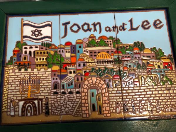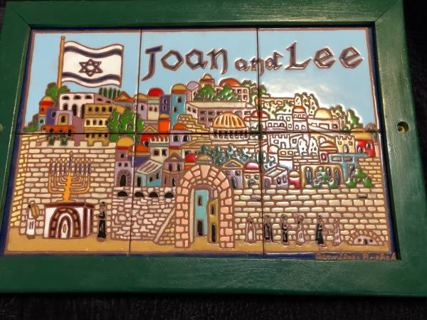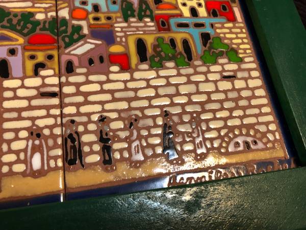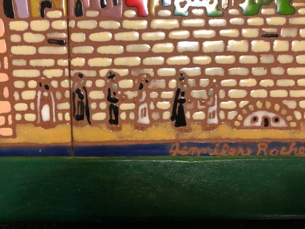Framed and signed hand-painted tiles by Jennifer Roche. She is a renowned local artist in St. Augustine, Fla. This piece was never hung or used and is in excellent condition except for a missing peg on the right side of the frame. It is 20” by 14” and is comprised of 6 tiles.