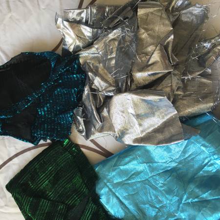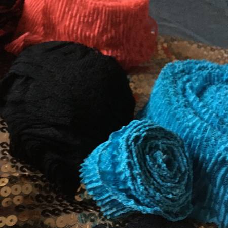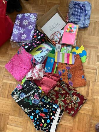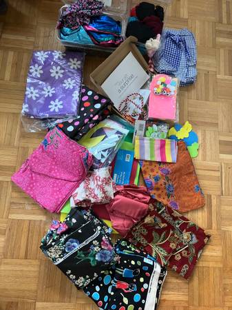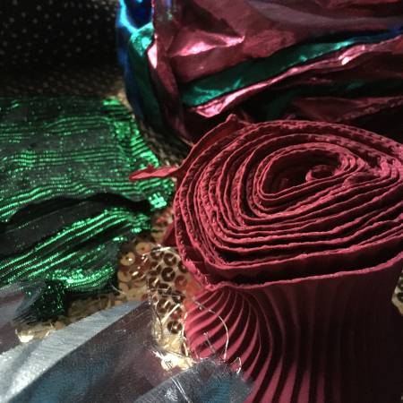 Lot of fabrics woven, foam, Metallics, crepe ribbon, black lace, lace, etc large pieces, some pieces small. Great for quilting, clown costume, puppet making materials. 3 plastic table cloths. Cash...