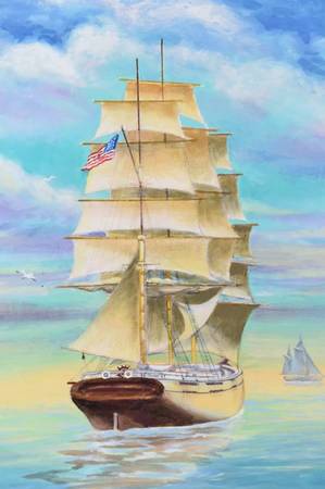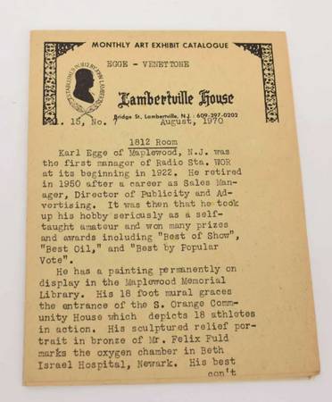Karl Egge Oil on Canvas on Artist Board of 'Heading For Cape Horn', together with original Lambertville House NJ August 1970 monthly art exhibit catalog listing this painting.