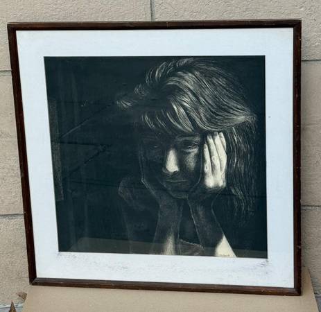 'Pondering Girl' Large Signed Lithograph Art w/ Original Vintage Wood Frame for Sale.