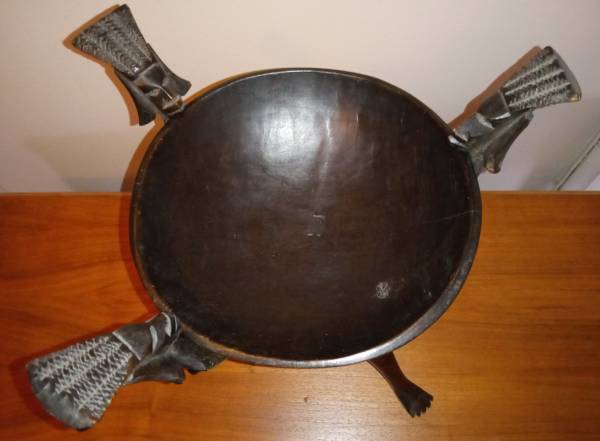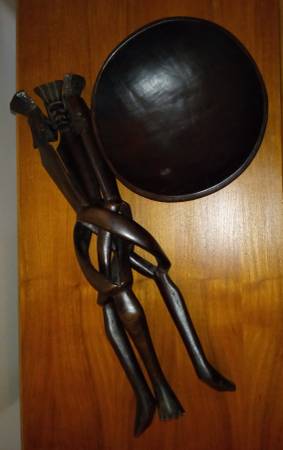 SMALL African Carved Wood Interlocking Stand with Bowl $50 Cash Only Stand is made of three (3) interlocking figurines that can be folded together Or when open, it supports a small bowl Perfect size...