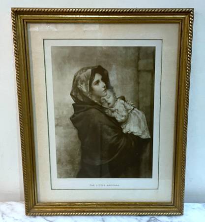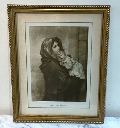 "THE LITTLE MADONNA" ANTIQUE PRINT DEPICTING THE VIRGIN MARY After the painting by Roberto Ferruzzi Published by St. Anthony's Guild, Paterson NJ Frame size: 17" 1/2 x 14" Available for pick-up only...