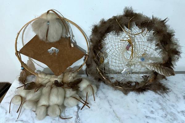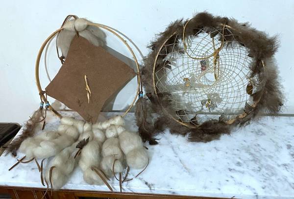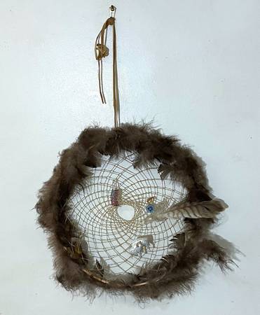 TWO BEAUTIFUL VINTAGE DREAM CATCHERS DECORATED WITH FEATHERS, LEATHER, FIBER AND OTHE MATERIALS The largest: 20" tall 12" diagonal The smallest: 12" diagonal Condition: One has some feathers...