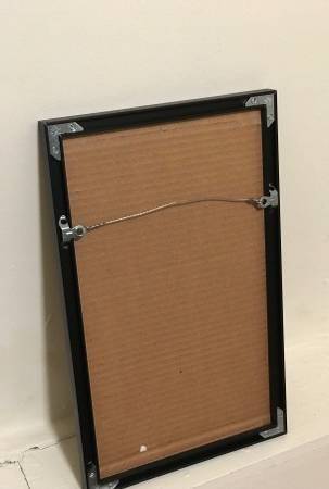 Matte black aluminum frame with built-in hanger and light glass with cardboard backing.