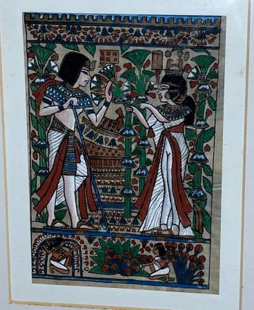 VINTAGE EGYPTIAN FRAMED HAND PAINTED PAPYRUS OF A PHARAOH AND WIFE -...