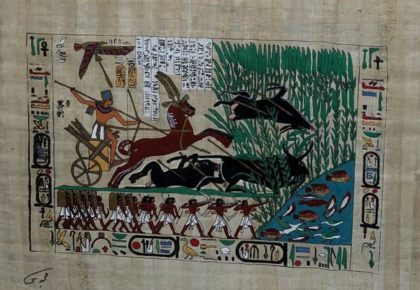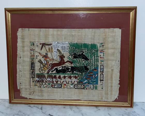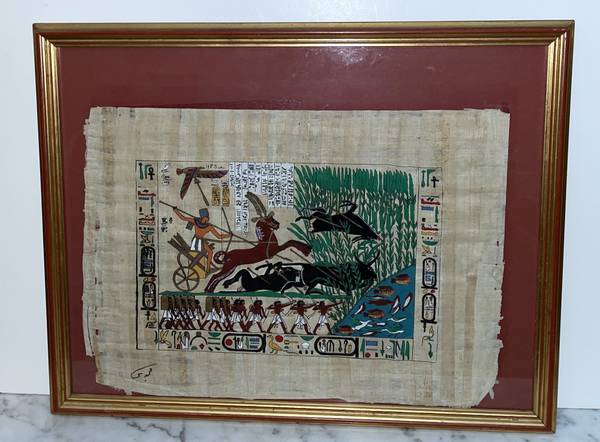 VINTAGE EGYPTIAN FRAMED HAND PAINTED PAPYRUS OF A PHARAOH HUNTING -...