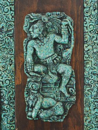 A green colored resin sculpture simulating jade, on wooden plaque, based on Mayan reliefs of a high personage, deity or priest. The plaque depicts figurines surrounded by traditional ornaments.