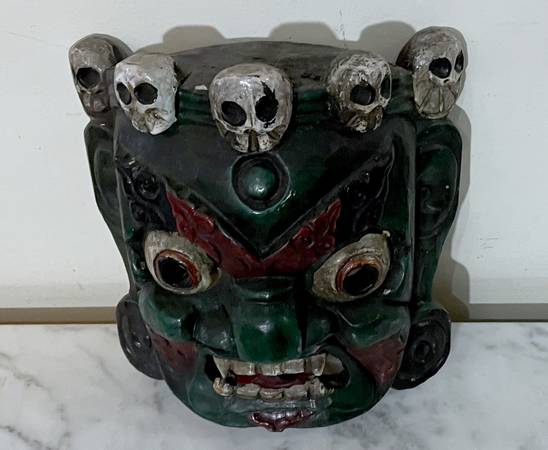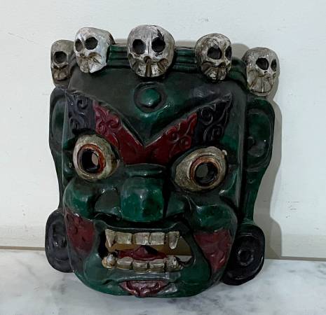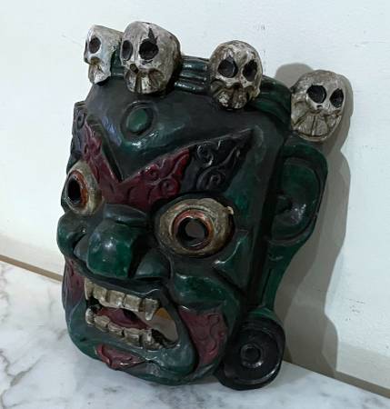 VINTAGE NEPAL PAINTED CARVED WOOD MASK OF A MONSTER WITH 5 SKULLS ON HEAD