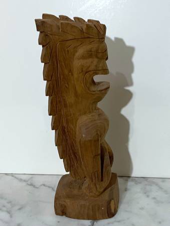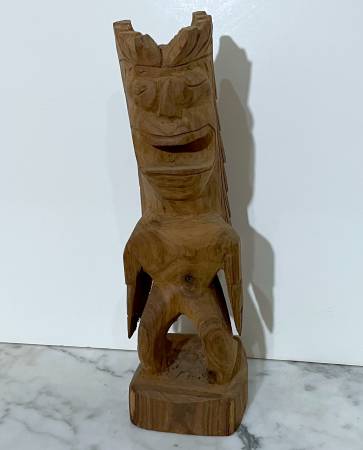 UNIQUE VINTAGE CARVED WOOD TRIBAL OCEANIC STATUE OF A STANDING MONSTER OR DEITY Size: 10" 5/8 tall 3" 1/2 wide 3" 1/2 deep CONDITION: Some surface wear, a surface split on the back of statue, as...