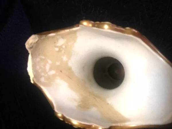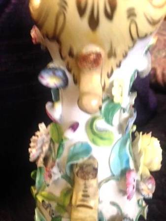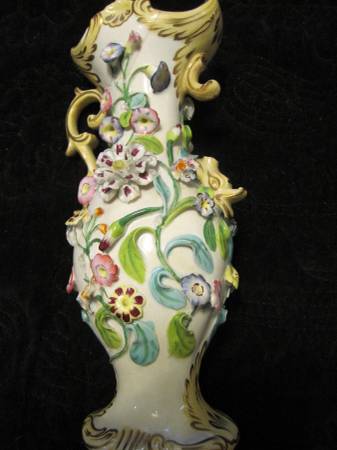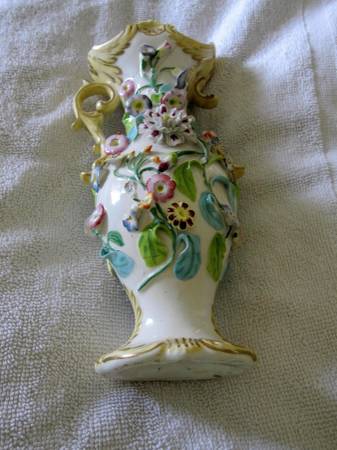 Antique porcelain decorative vase, white with pastel-colored flowers, 9 1/2" high, and 4" wide, unknown manufacturer, has repairs and is missing an edge and 2 small pieces
