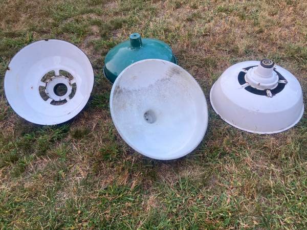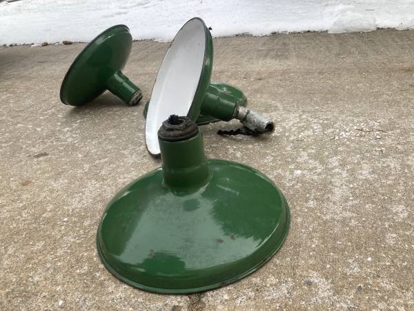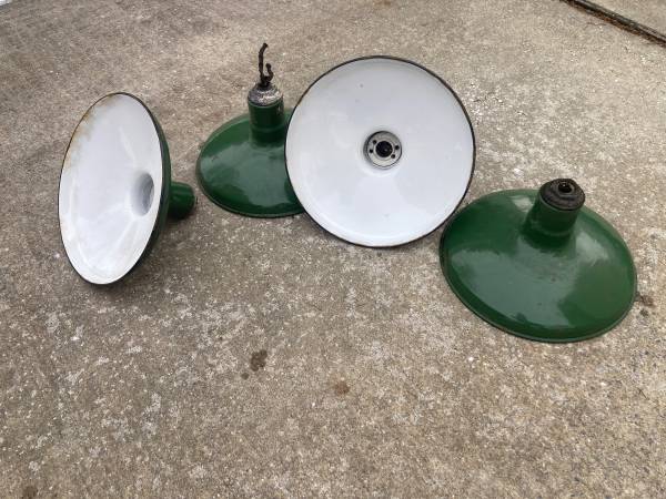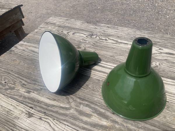 Selling large Vintage Industrial porcelain enamel lampshades / metal lampshades rescued from an area factory, a school, and other industrial properties circa 1920s through 60’s