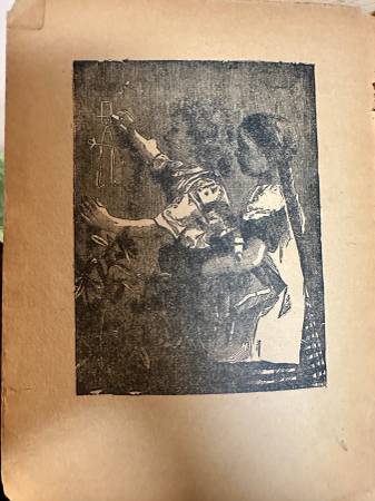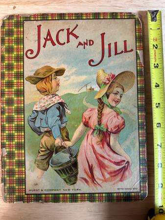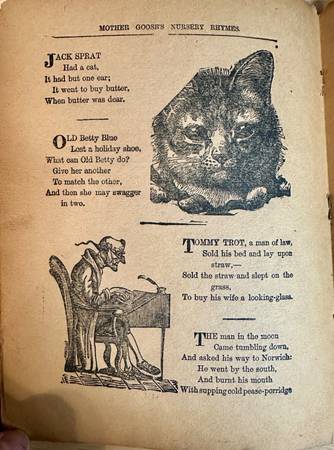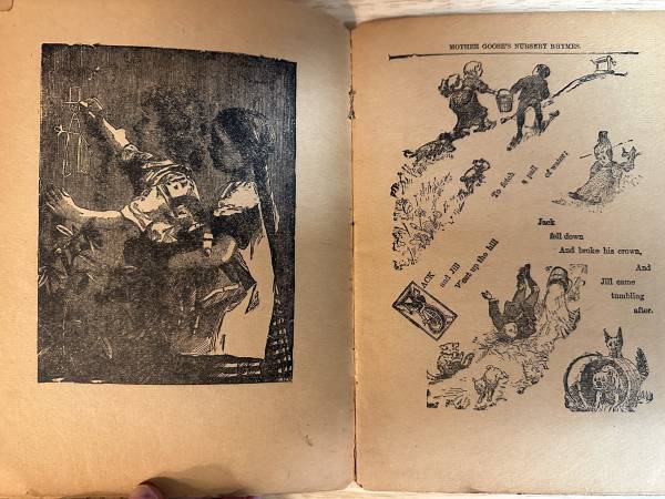 My research says this children's book is from the early 1900's, and it looks it. The pages of this vintage edition by Hurst and Company are brown and cracked, and you need to be very careful turning the pages. This is part of the "Mother Hubbard Series" and is filled with children's nursery rhymes, both familiar and obscure. It's got some wonderful illustrations worthy of framing. My mom often tore illustrations out of ancient books, framed them, and hung them in our apartment. I wouldn't be surprised if that is what she had in mind for this book.