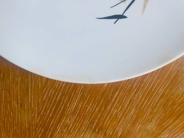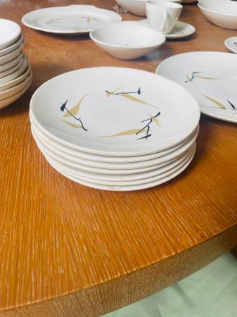 Condition varies. The bowls in general are in very good condition (one has a stain that probably indicates a hairline crack. The dinner plates are not in great shape, all but two have either chips or a patch of slight staining next to the rim under the glaze.