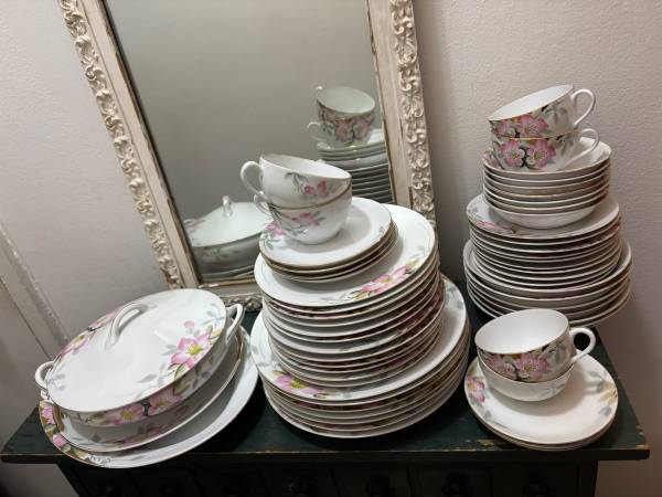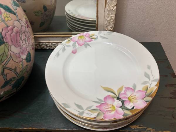 This is a beautiful set of vintage NORITAKE china in the "Azalea" pattern made in Japan in the 1920-30s...famous for its charm and elegance and very collectible to this day. Each piece is hand painted featuring azalea flowers with green foliage trimmed in gold. The set would make a lovely addition to any table and home decor.