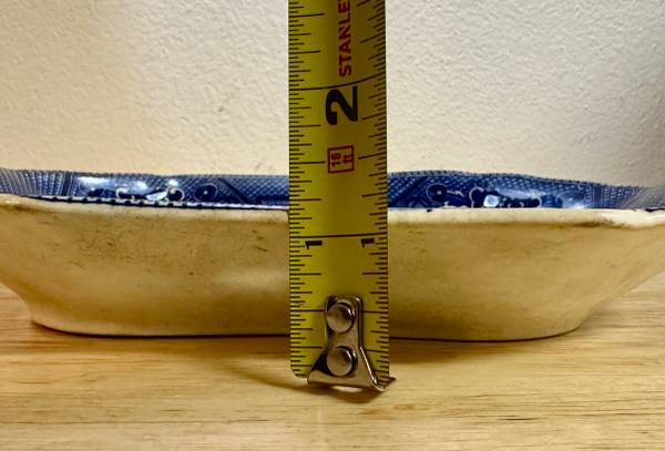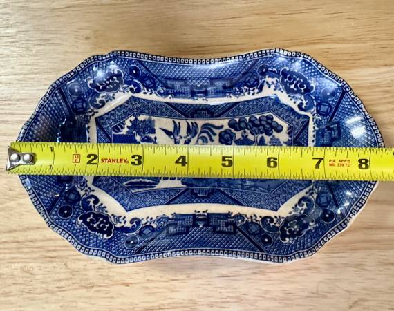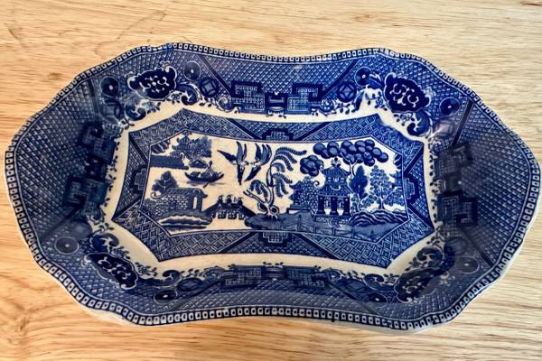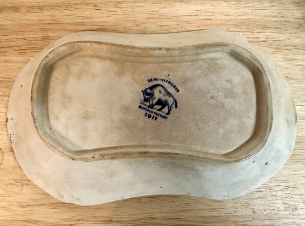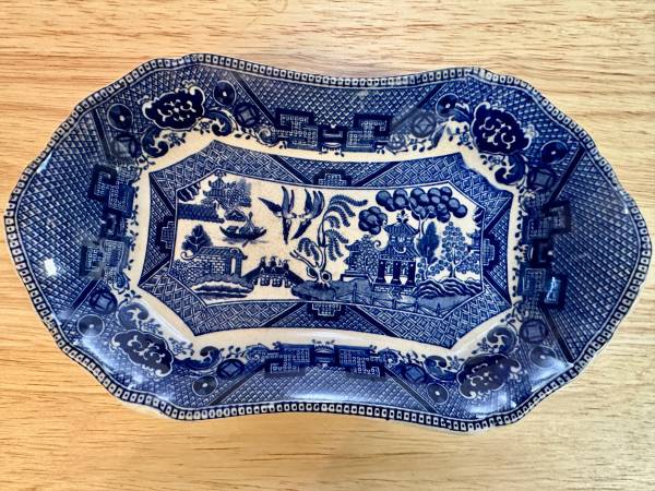 Antique Blue Willow Relish Dish. Semi-Vitreous Buffalo Pottery. Nice condition, although the whites are showing signs of browning, especially on the base. I'm really not sure what this uniquely shaped dish is for. Relish? Bones? Finger food? In any case, for all you Blue Willow fans out there, here's a rare one for you.