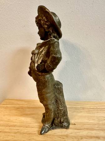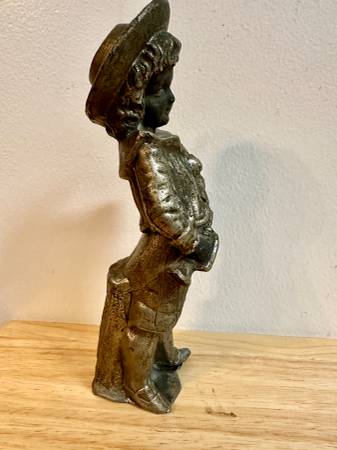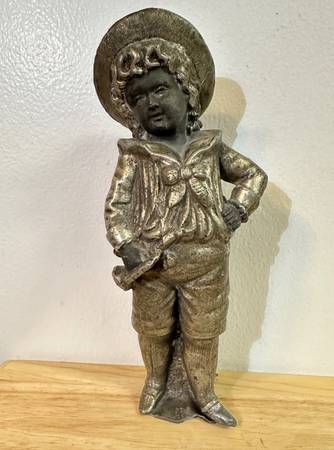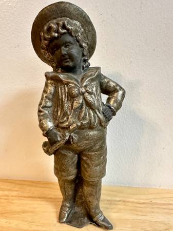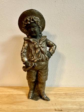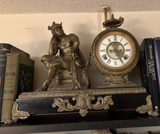 While my mom was busy collecting and selling antiques, my dad bought, repaired, and sold old clocks. One type of clock in particular caught his fancy - the Ansonia - which typically features an iron or bronze statue of a figure, often mythic, dressed in ancient garb. (See last photo for an example of an Ansonia clock. Clock NOT for sale!) Dad collected these beautiful metallic figurines for his Ansonia clocks, but in the end he ended up with more figurines than clocks. Dad passed a few years ago, and I am selling off his collection of these Cast Iron Clock Toppers. This particular piece is 8" tall and has been wonderfully and evocatively darkened by time.