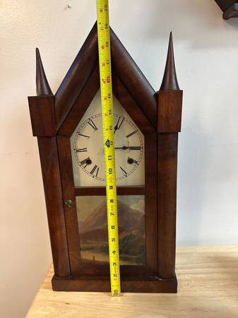 This is an Antique Chauncey Jerome Steeple Clock. Probably built in the mid to late 1800's. This is just a wonderful piece. The wood is in beautiful condition, and would look great on any mantle or shelf. The hand painted glass bottom is gorgeous and in great condition. The clock face itself is cracked from age, but I think that gives the clock additional character. (It is possible to buy replacement faces, but I'd recommend against it.) The two towers have tiny asymetricies. Intentional or due to a minor repair, I couldn't say. 10" wide at base, 20" tall at highest point, 4" deep.