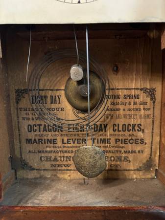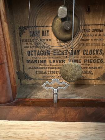 Back when I was a kid, while my mom was busy collecting and selling antiques, my dad bought, repaired, and sold old clocks. This is one such clock. Needless to say, you don't need to be a clock afficianado to admire this beauty. When my dad was alive the clock kept time, ticked, and bonged. Today, the pendulum still swings and the bong still strikes. Both pendulum and bong can be wound. However, after a few minutes, the pendulum will come to a stop. Since I know this clock used to work, I believe all it needs is to be adjusted. The clock comes with key.