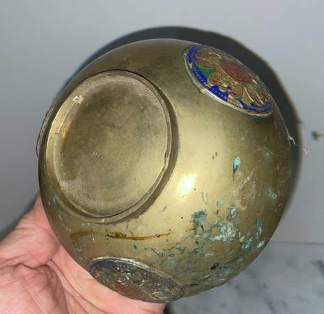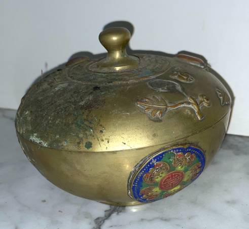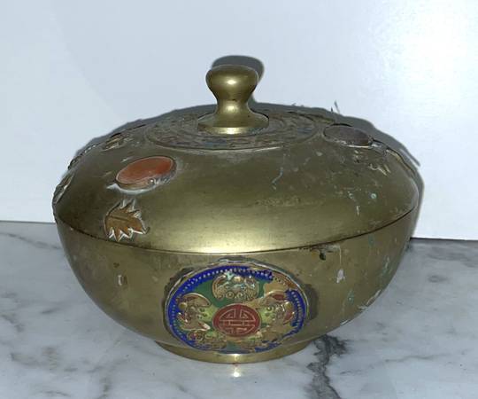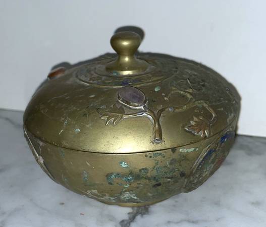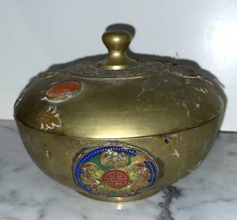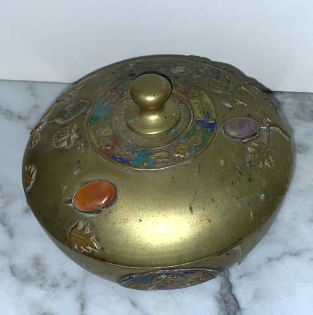 BEAUTIFUL ANTIQUE CHINESE METAL BOWL WITH LID WITH STONES MEDALLIONS AND FLOWERS Size : 3" 6/8 tall 5" 1/8 diagonal CONDITION: In very good vintage condition Available for pickup only 78th Street...