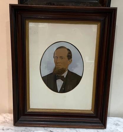 LARGE ANTIQUE 19th CENTURY HAND PAINTED OVAL PHOTOGRAPH PORTRAIT OF A GENTLEMAN WEARING A MASONIC PIN ON HIS LAPEL, IN ANTIQUE WALNUT VICTORIAN FRAME Image size: 11" 1/2 x 9" 1/2 Frame size: 25" x...