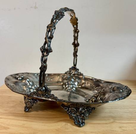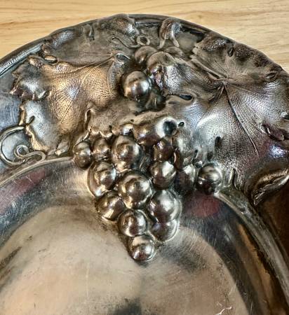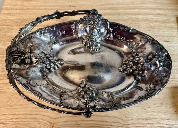 Ornate silver plated fruit bowl with intricate handle design. Manufactured by Homan, patent 1903. The handle is actually a grape vine, the bowl and its legs grape clusters. Beautiful, shiny, excellent condition. It does have a bit of a wobble due to one leg being about ¼" off the plane. (See last photo.) I think it could easily be bent into place, but I'll leave that to you.