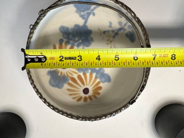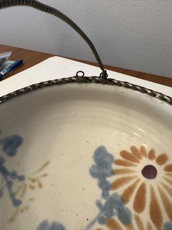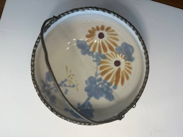 This is a vintage Japanese Awaji Porcelain Bowl with woven metal overlay and basket handles. (One of the two woven handles is missing.) This is a lovely piece, hard to find, and usually goes for a lot more money.