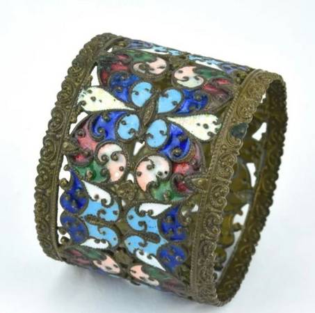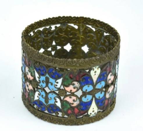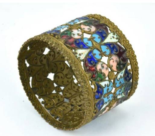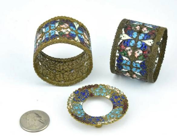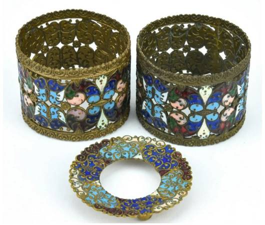 2 ANTIQUE JAPANESE CHAMPLEVE ENAMEL NAPKIN RINGS AND 1 CANDLE VOTIVE All 3 pieces are approx. 2" diagonal $25 for all three Available for pickup only 78th Street / First Avenue