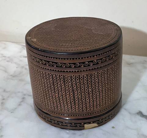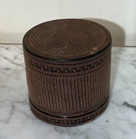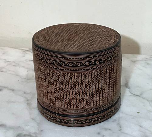 BEAUTIFUL ANTIQUE LACQUER SOUTHEAST ASIA BETEL NUT BOX - GORGEOUS DESIGN DETAILS I don't know the region it comes from, but suspect it is Thai. Size: 3" 7/8 Tall 4" 2/8 Diagonal Condition: Surface...