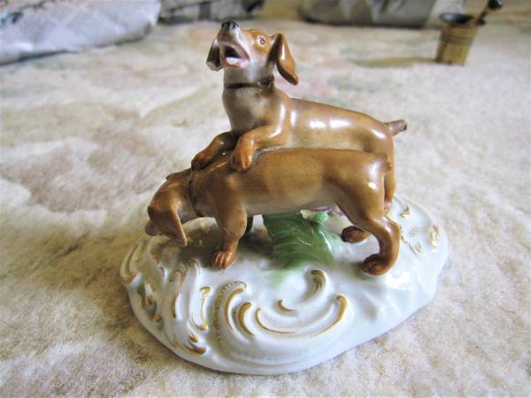 Meissen figurine of 2 dogs, 3 1/2" by 2 3/4". This figurine is probably circa 1930. The tail on one dog is repaired. The other tail is missing. One ear is chipped. The color and shape of this...