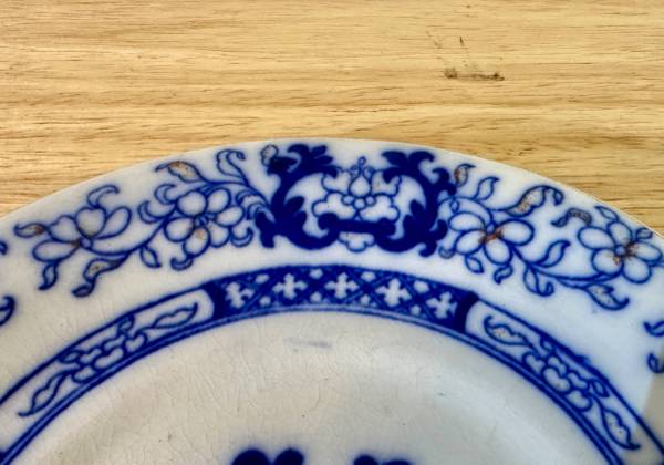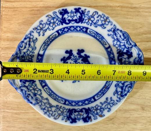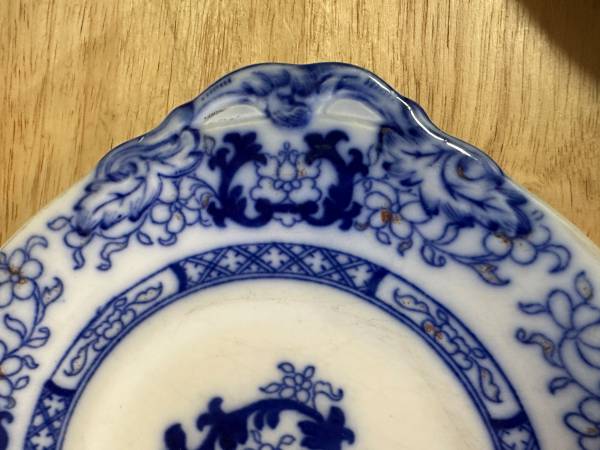 A beautiful antique Mintons Blue Flow Two Handled Small Plate. Unique shape. Hard to find. My research says this is dated 1911. Nice condition, although the bottom rim has some tiny chips. (See photo) Tiny little red embellishment are part of the design. There is some kind of a illeglible mark stamped into the porcelain base. Mom had this plate hanging on our kitchen wall, as she did many of her favorite pieces. Very collectible. I'm not really sure what the handles were for, but would make a nice serving plate for appetizers.